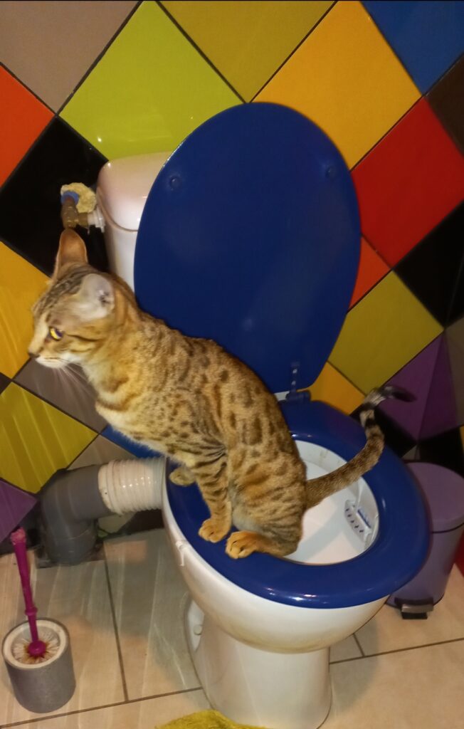 En parlant de cela, ajoutons que c’est une race très intelligente. Les Savannah apprennent très vite à ouvrir les portes, ramener des balles et toutes sortes d’objets voire…à aller aux toilettes. Un exemple ci-dessous