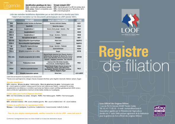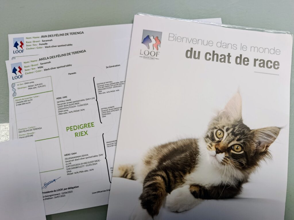 • l’éleveur doit avoir fourni au L.O.O.F : les A.D.N des parents du chaton, les tests génétiques Pkdef et PRA-RDAC des parents qui doivent être négatifs ou porteurs sains (voir rubrique santé), avoir fait les A.D.N des chatons et réalisé les tests de filiation des chatons (obligatoire pour les Savannah depuis juillet 2024) par l’un des 3 laboratoires agréés par le L.O.O.F ( Antagène, Genindexe ou MyCatDNA via le compte MyLOOF de l’éleveur)