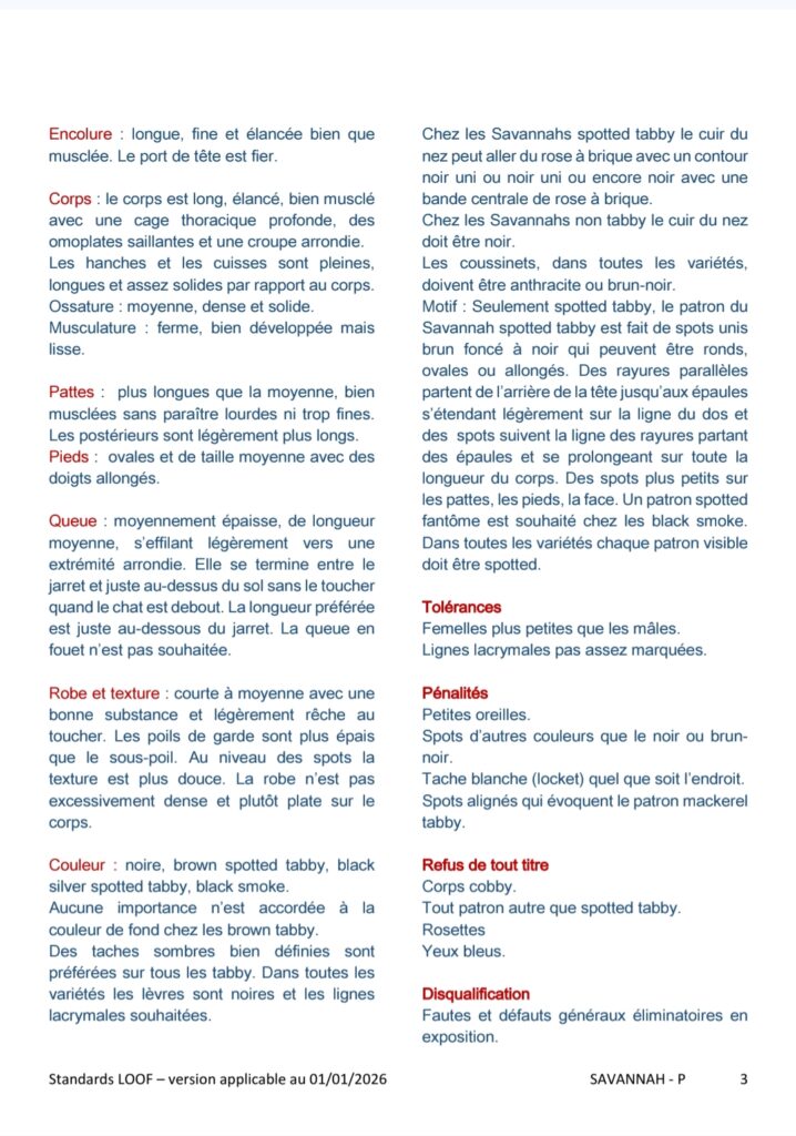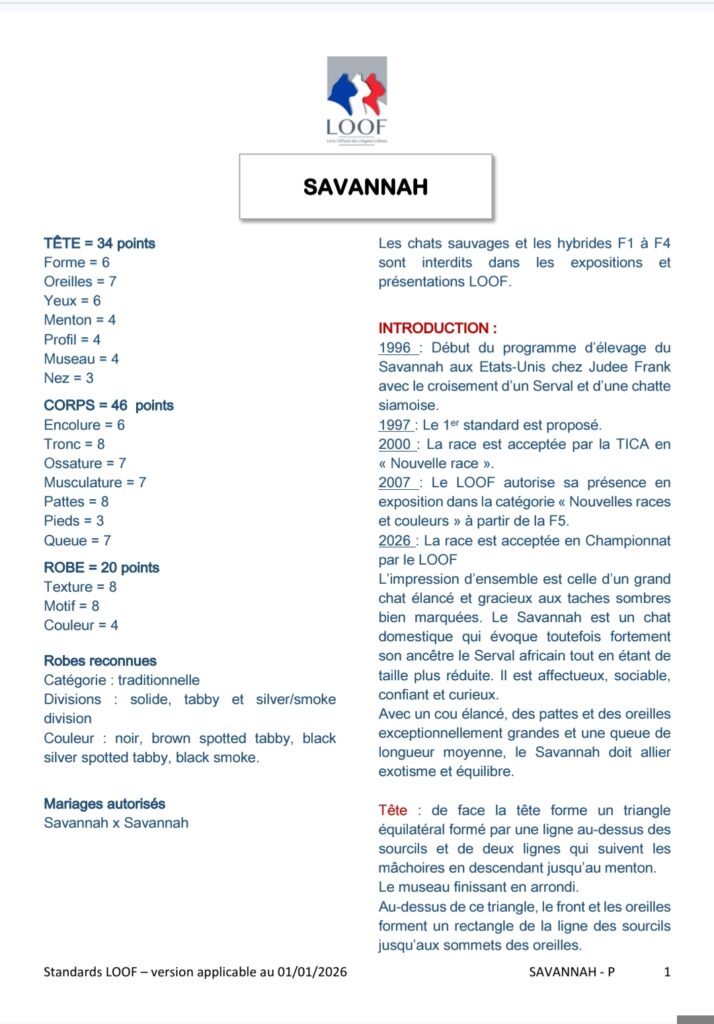 Pour finir sur cette vidéo, lorsque Mme la Juge parle de l’acceptation de la Race Savannah par le LOOF, elle parle du fait d’être acceptée à concourir en championnat. Le Savannah est en effet encore à ce jour sous le statut de Nouvelle Race au LOOF, mais est reconnue (voir section LOOF de ce site)